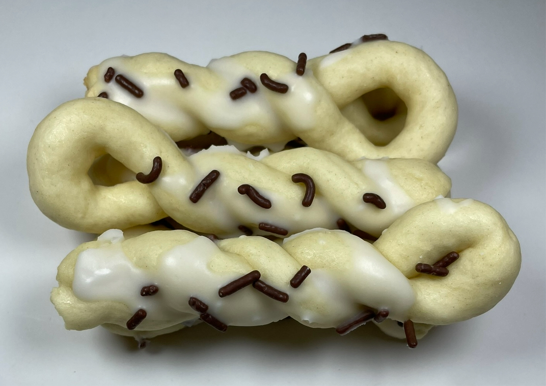 The Anise are Lightly Sweet Vanilla Dough Encased in Crisp Anise Icing Topped with Chocolate Sprinkles and Pair Great with Coffee or Dessert Wine!
