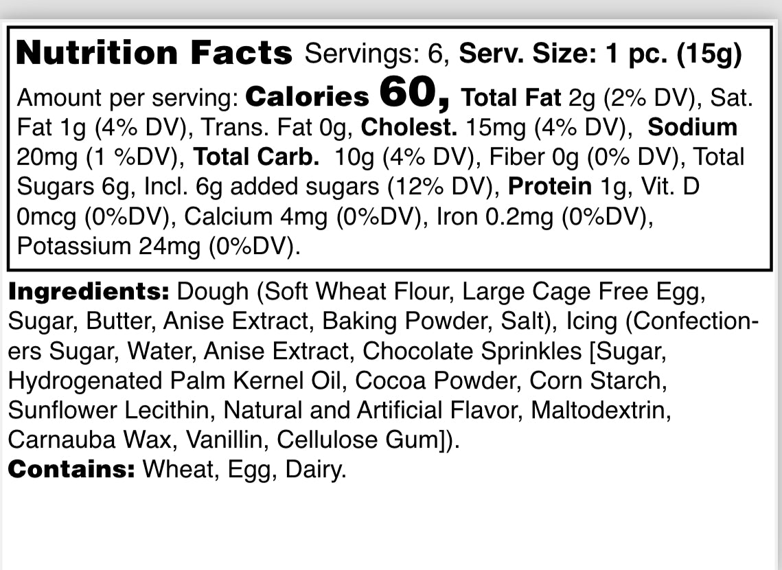 Ingredients : Enriched Flour, Butter, Eggs , Sugar , Salt , Anise Extract.