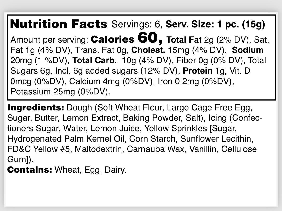 Ingredients : Enriched Flour, Butter, Eggs , Sugar , Salt , Natural Lemon Extract.