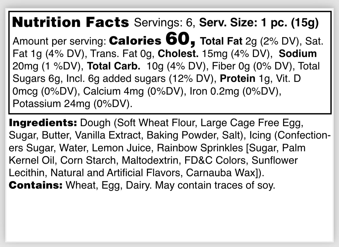Ingredients : Enriched Flour, Butter, Eggs , Sugar , Salt , Natural Vanilla & Lemon Extract.