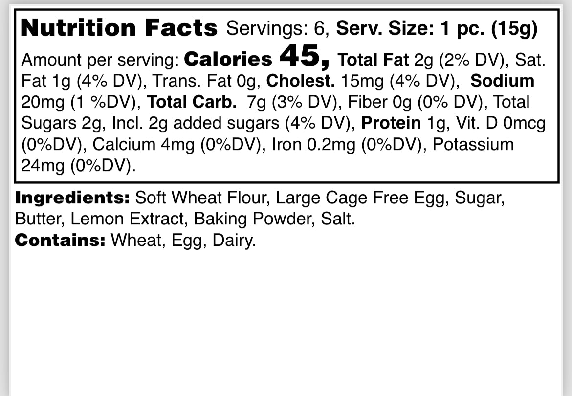 Ingredients : Enriched Flour (Wheat , Flour , Niacin , Reduced Iron, Thiamine , Mononitrate , Riboflavin and Folic Acid) , Butter, Eggs , Sugar , Salt , Natural Vanilla